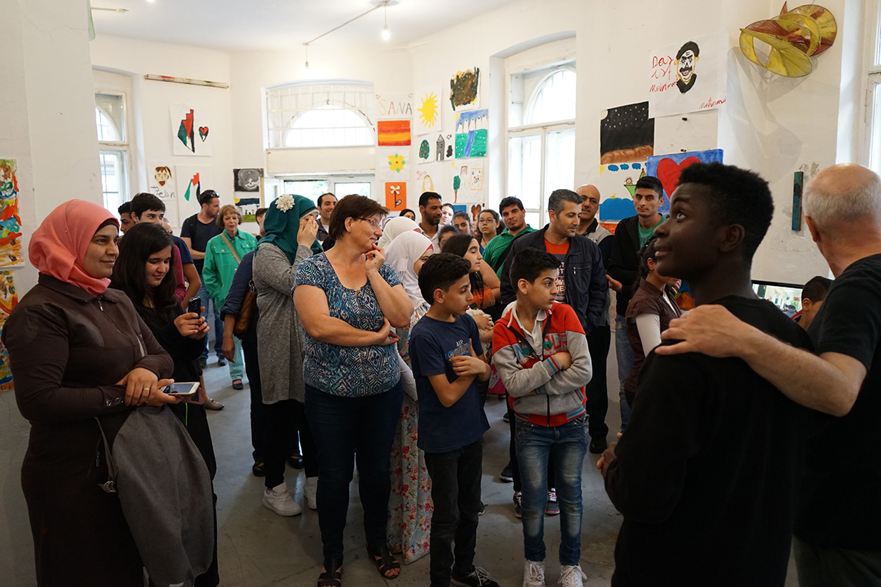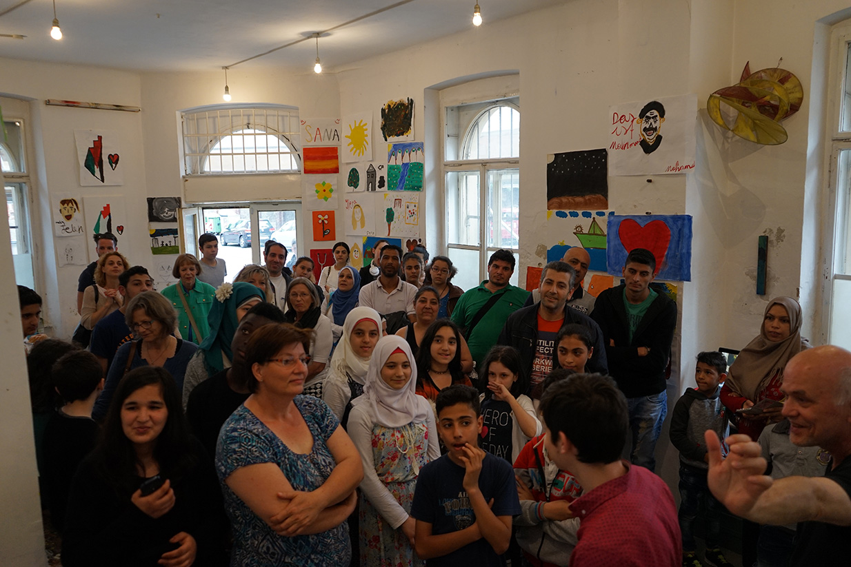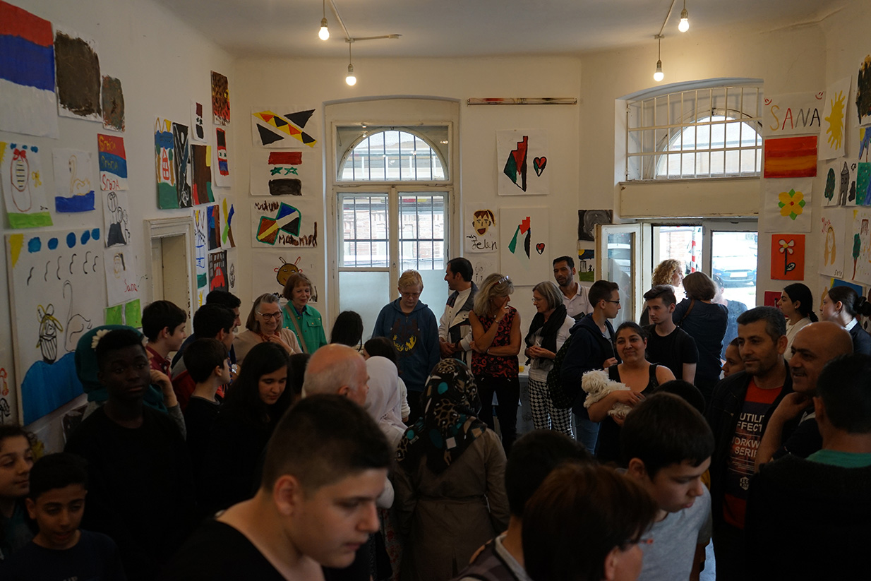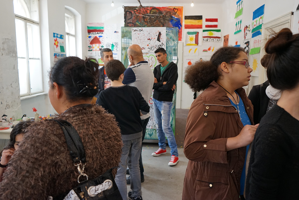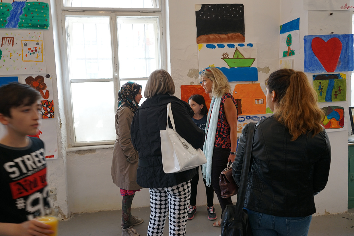 Das Kunstprojekt jetzt hier – Flüchtlingskinder machen Kunst wurde mit der Ausstellung der Werke im KUNSTBETRIEB abgeschlossen. Das zahlreich erschienene Publikum konnte Malerei, Fotos und Videos von und mit Kindern aus 8 Staaten betrachten. Die Werke kreisen um die Begriffe Heimat, Reise (Flucht) und jetzt hier (in Wien).